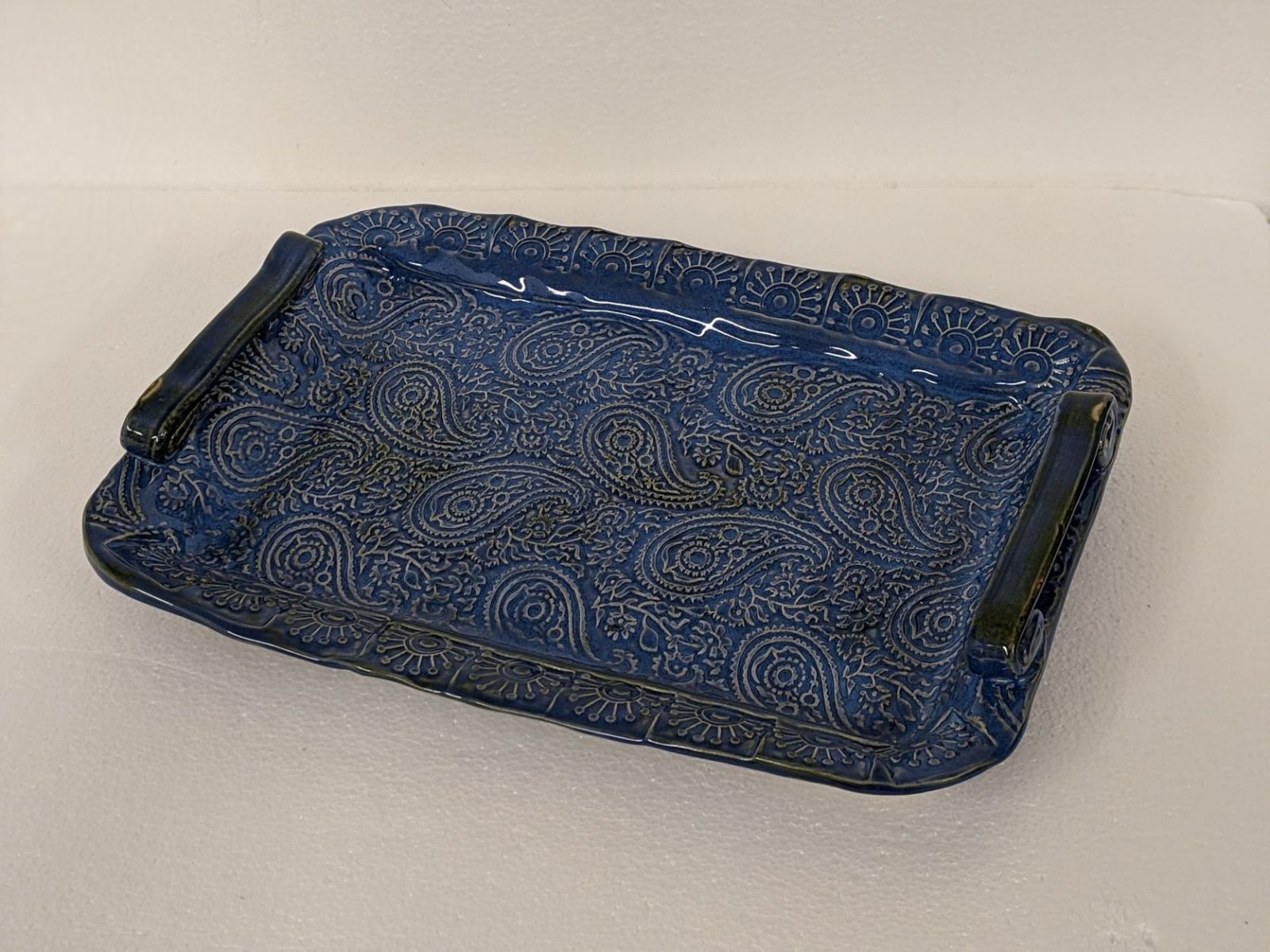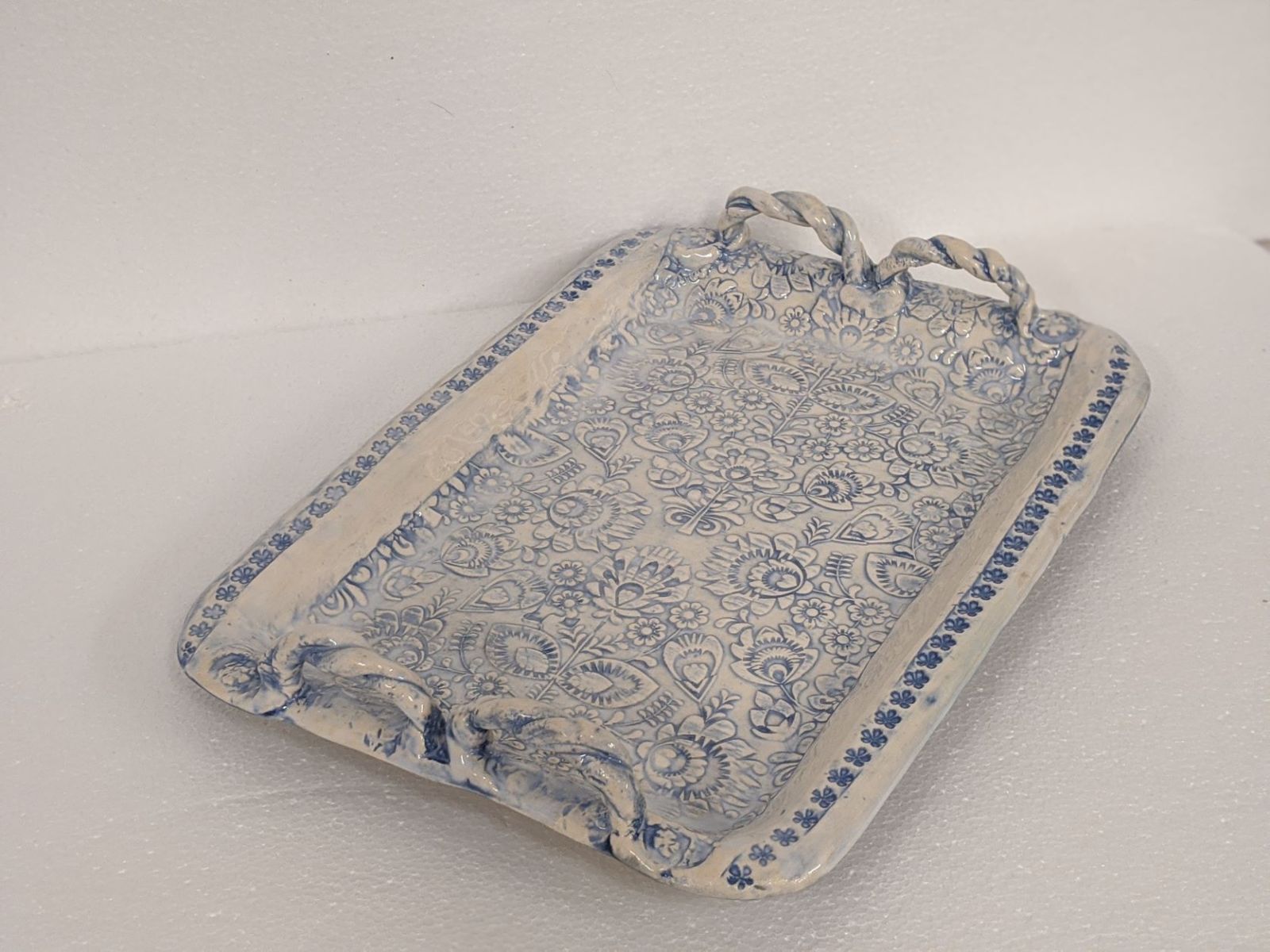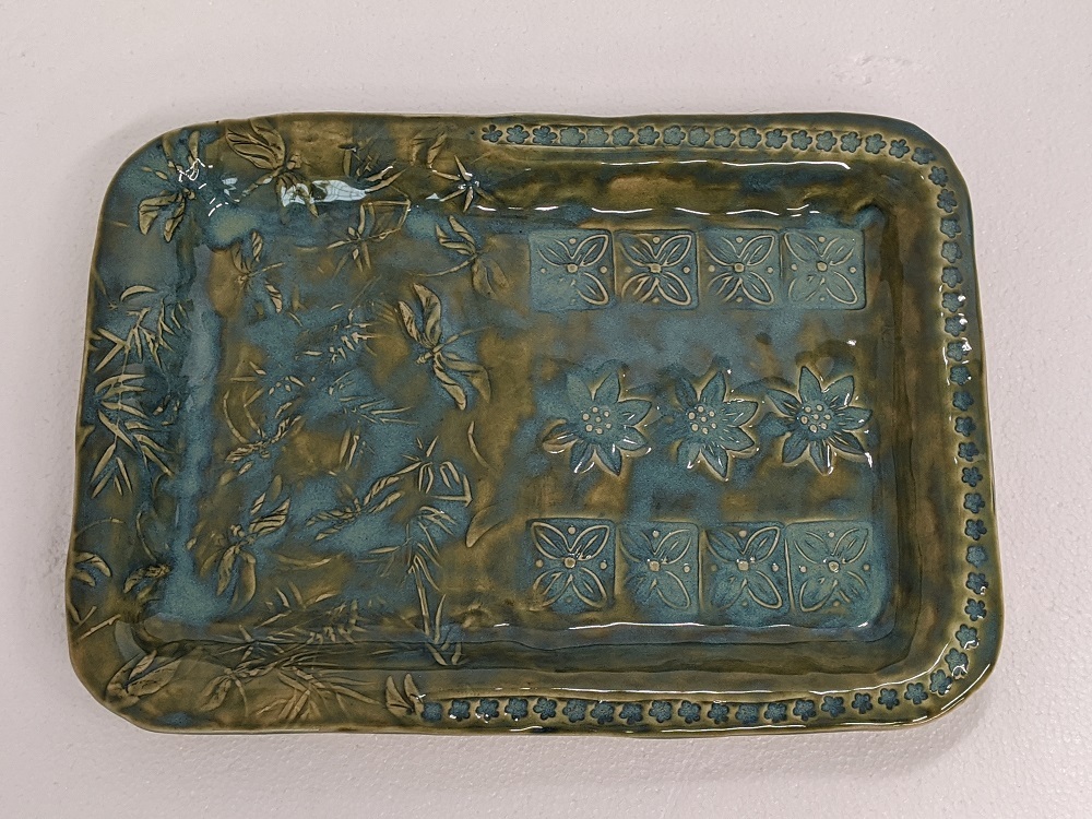 Beautiful and functional…what could be better? Using a mold and a slab of clay, you will make a tray that reflects your own creativity. This is a two day event. The first day we will make the tray, and decorate with stamps to provide texture, or you can use one of the many rolling pins I have with beautiful unique textures. You can add handles…or not. The second day, the following week, you will glaze your tray. The first day will likely take the full two hours as contemplating the many ways to decorate takes time. The second week, when you will glaze your tray, will take around an hour. The tray is dishwasher safe, microwavable, and ovenproof, if protected from thermal shock. The tray is about 12 x 8 by about 1 inch deep.