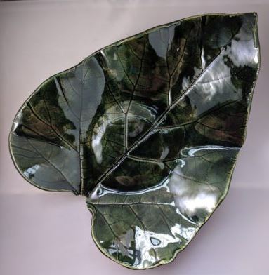 Catalpa trees grace our roadsides and yards. Giant fast growing trees with beautiful white flowers. What is most unique about catalpa trees, though, are its huge leaves. Often a foot long, they make great natural formed bowls or dishes. They have wonderful unique veining that easily transfers to the dishes. Hosta leaves are likewise as big and can also be used, but their veining system is not as interesting. Leaves will be provided and you can choose the leaf you want to use, or you can bring your own. (Nothing bigger than a foot long, though, please) The class is limited to 8 people and will take two sessions, August 10 and 17 from 3 – 5 pm. The first session will focus on making the dish, the second session, the following week will focus on cleaning up the dish to prepare it for glazing and then actual glazing. Click here for tickets: catalpa leaf