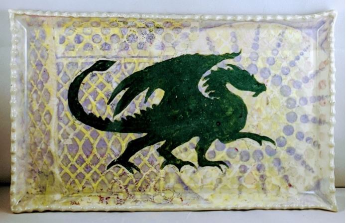 The plates will be made using a mold, and then finished on the potter’s wheel. The first day of this 2 day workshop, will be spent making the plates. The second day will be spent using underglazes to decorate the plate. A method of mono-printing will be used. Various stencils of prints will be used and layered on each other. A final stencil, that will be the focal point of the plate, will be used. Students will be encouraged to find their own final design that I will print out for them. Simple silhouette designs of dragons, flowers, mandalas, trees, animals….are all possibilities.