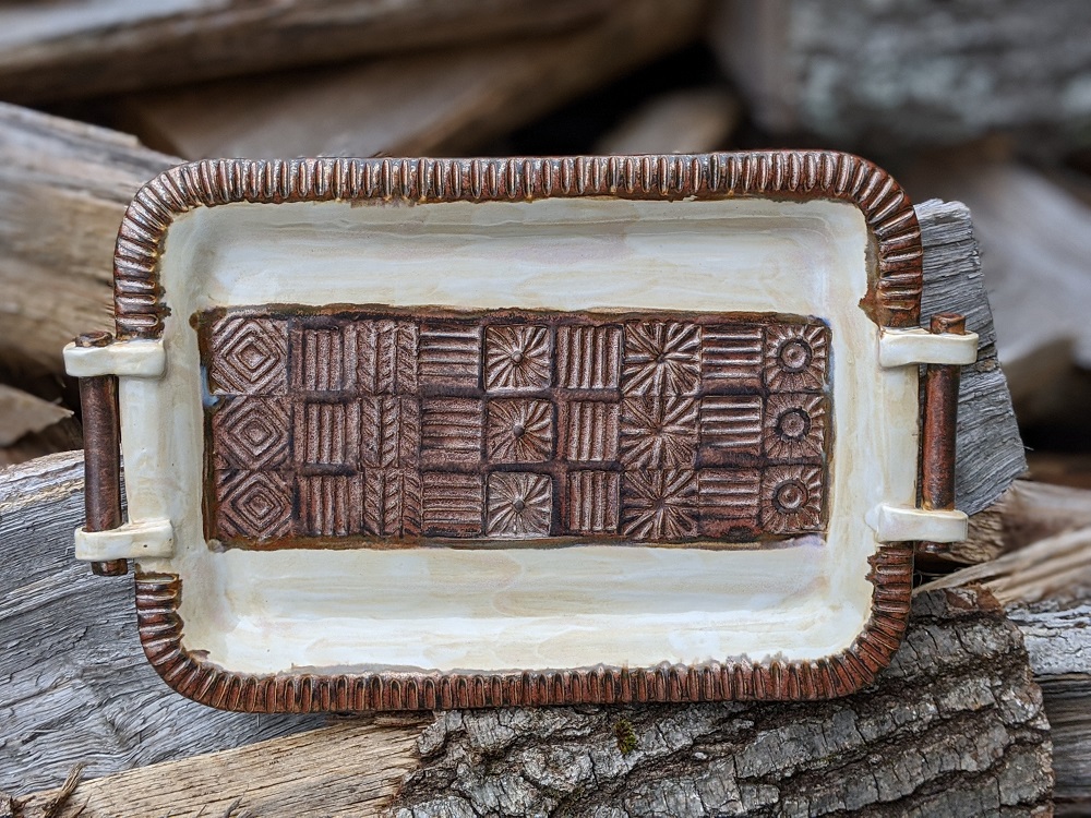 The next week, Sept. 22, you will make a clay platter. Your stamps will have been “fired”, so that they will be hard enough to stamp the clay, and can be used on your platter. The platter is about 14 x 11 inches*. The final platter will be oven proof, dishwasher safe, and microwavable.